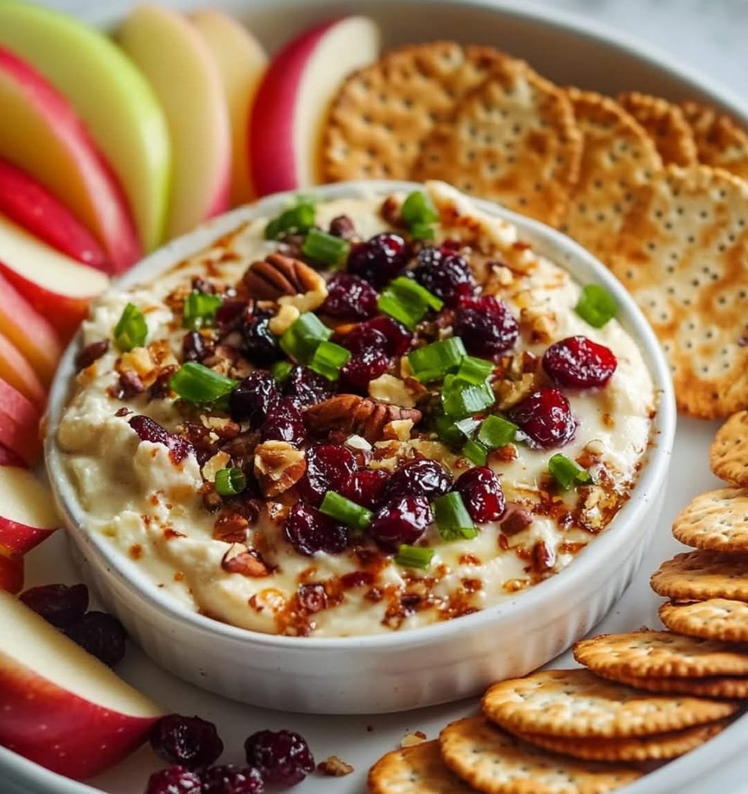 This creamy and festive dip combines tangy cranberries, crunchy pecans, and smooth cream cheese for a perfect appetizer during the holidays or any gathering.