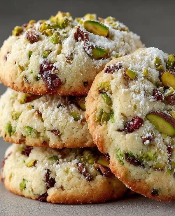 These holiday-perfect shortbread cookies combine buttery dough with tart dried cranberries and crunchy pistachios. They’re crisp at the edges, tender inside, and not overly sweet — just the right balance for a delightful Mediterranean-style dessert with festive flair.