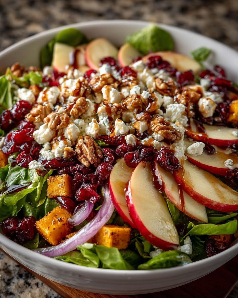 This Cranberry Walnut & Feta Harvest Salad is a vibrant, flavor-packed fall or winter salad featuring crisp mixed greens, tart dried cranberries, crunchy candied walnuts, creamy feta cheese, and fresh apple slices. Tossed with a maple-balsamic vinaigrette, it brings together sweet, tangy, and savory flavors for a perfectly balanced dish. Great as a holiday side, meal prep lunch, or light dinner with added protein.