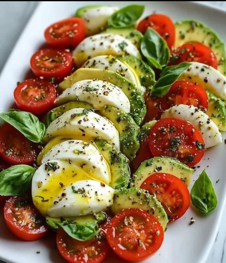 A fresh twist on the classic Italian Caprese salad, this version combines the creamy richness of avocado with soft, milky mozzarella, vibrant heirloom tomatoes, and fragrant fresh basil. Drizzled with a touch of extra-virgin olive oil and balsamic glaze, this salad is both visually stunning and indulgently creamy, perfect as an appetizer, light lunch, or side dish.