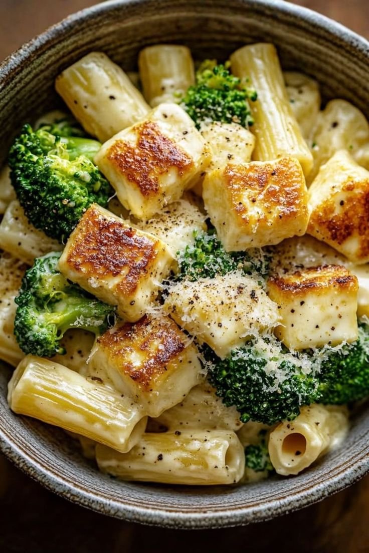 This dish combines golden pan-seared halloumi, tender broccoli, and al dente pasta in a light creamy lemon-garlic sauce. It’s vegetarian, high in protein, and full of Mediterranean flavors—creamy without being heavy.