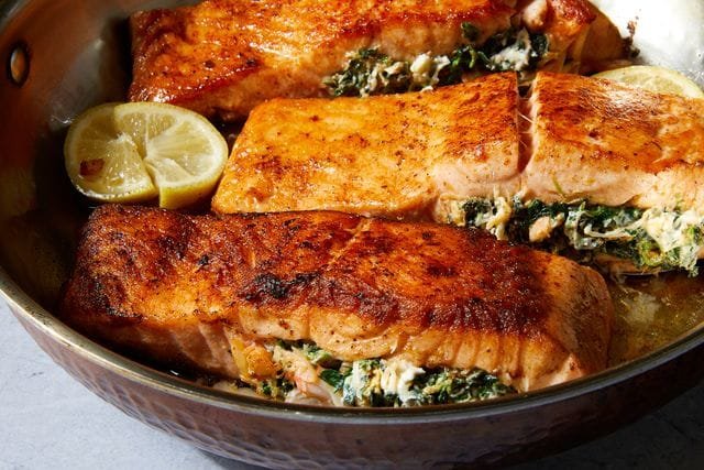 Make a pocket in each salmon fillet by slicing a slit with a paring knife. Then, season the salmon all over with the remaining 3/4 teaspoon salt and 2 tablespoons Cajun seasoning. Stuff spinach mixture into pockets.