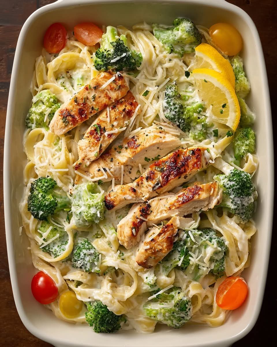This dish is a restaurant-style favorite — rich, creamy Alfredo sauce made with Parmesan and cream, combined with juicy chicken breast, tender broccoli, and fettuccine pasta. It’s hearty, indulgent, and surprisingly simple to make at home.