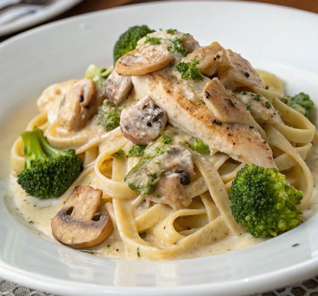 Creamy Chicken Fettuccine with Broccoli and Mushrooms