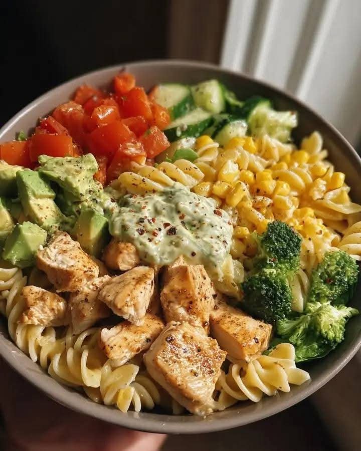 Creamy Chicken Pasta Bowl With Avocado, Veggies & Herb Sauce
