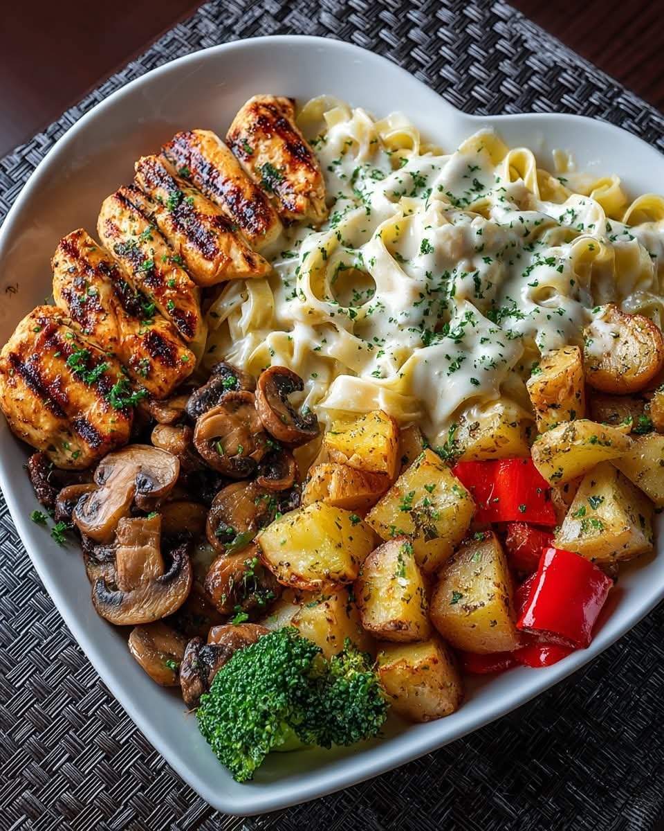 This comforting bowl brings together tender, juicy chicken tossed in a velvety creamy sauce, al dente pasta, and a colorful mix of roasted vegetables and crispy-seasoned potatoes. The combination of textures—creamy, crispy, savory, and slightly sweet from roasted veggies—makes this meal hearty and satisfying. Perfect for weeknight dinners or meal prep!