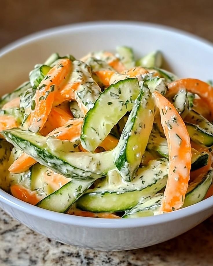 Creamy Cucumber & Carrot Salad is a simple yet satisfying dish that balances crisp vegetables with a smooth, flavorful dressing. Thinly sliced cucumber adds freshness and hydration, while carrots bring natural sweetness and a pleasant crunch. A light yogurt or sour cream dressing ties everything together with a creamy texture and a gentle tang from lemon juice or vinegar.