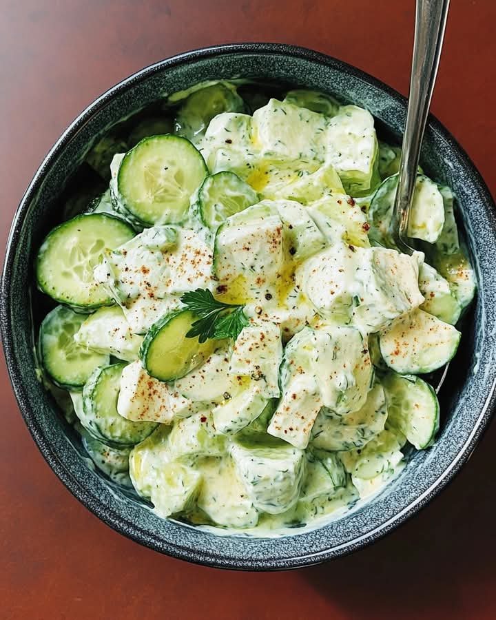 Creamy cucumber salad is a light, refreshing side dish made with thinly sliced cucumbers, a tangy-sweet creamy dressing, and a touch of dill. It’s perfect for summer barbecues, potlucks, or a simple weeknight dinner. The creaminess balances the crisp cucumbers and the slight tang of vinegar or lemon juice adds a refreshing finish.