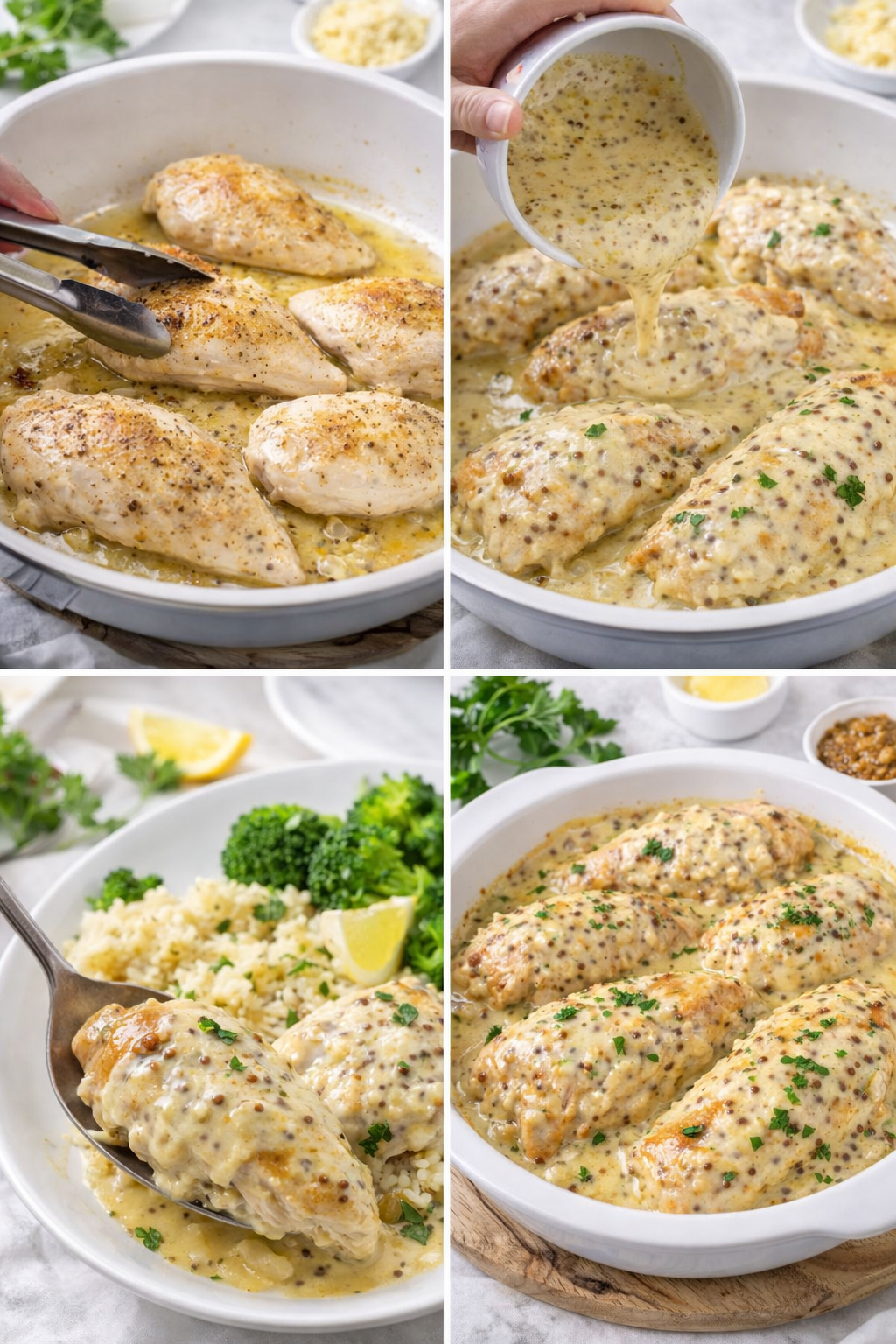 A rich, comforting chicken dish where tender chicken breasts are cooked in a creamy, tangy sauce made with Dijon mustard, garlic, cream, and herbs. The mustard adds a gentle sharpness that balances perfectly with the cream, creating a restaurant-style meal that is simple enough for home cooking.