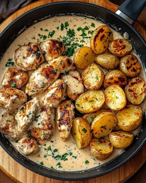 Creamy Garlic Chicken Bites with Crispy Roasted Potatoes