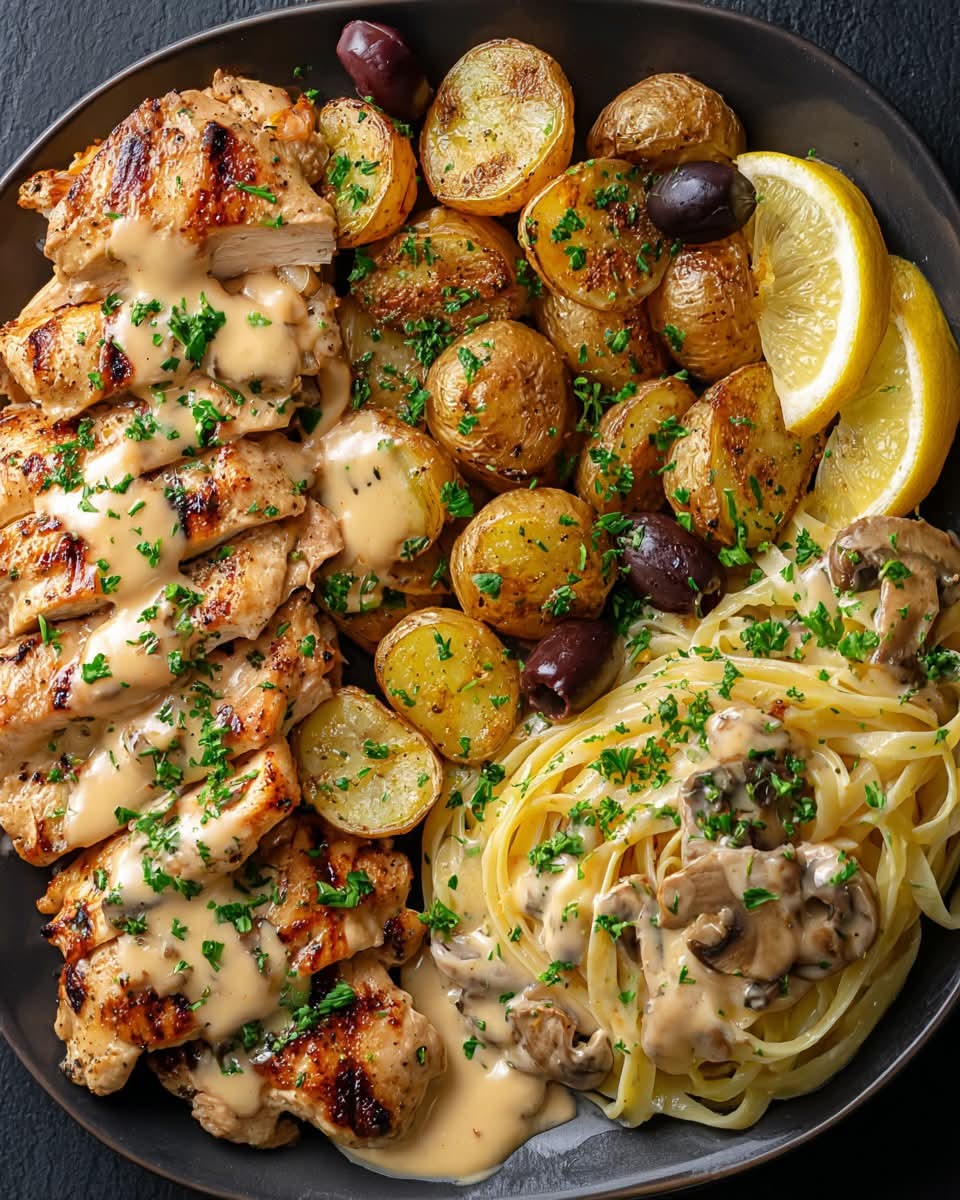 This dish combines tender chicken simmered in a creamy garlic sauce, crispy herb-roasted potatoes, and silky lemon tagliatelle. The balance of rich creaminess, zesty freshness, and comforting carbs makes it perfect for both weeknight dinners and special occasions.
