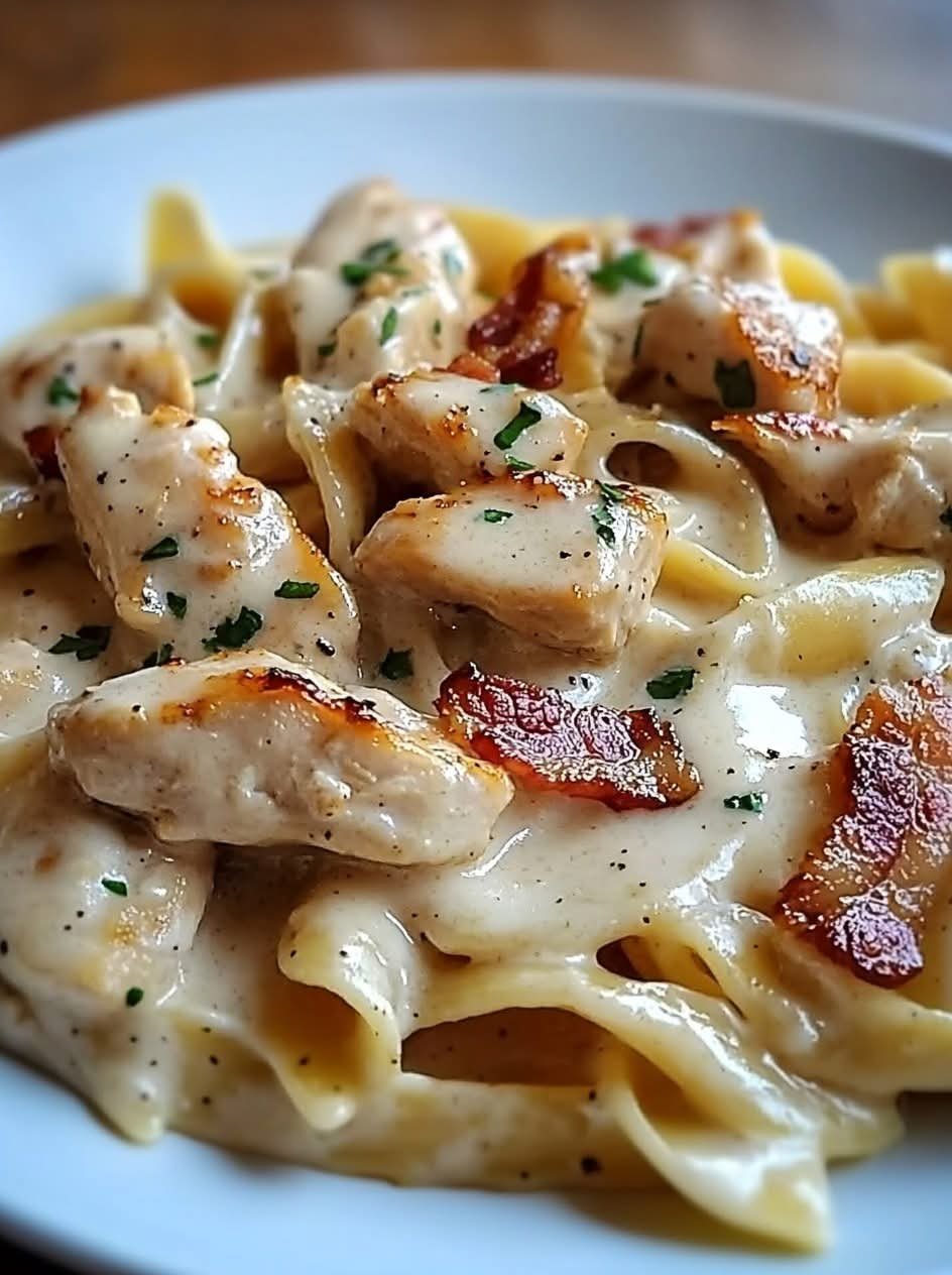 This pasta combines juicy golden chicken, smoky crispy bacon, and a silky garlic herb cream sauce that coats every bite. The soft, melt-in-your-mouth cheese creates a naturally flavorful sauce without complicated ingredients.