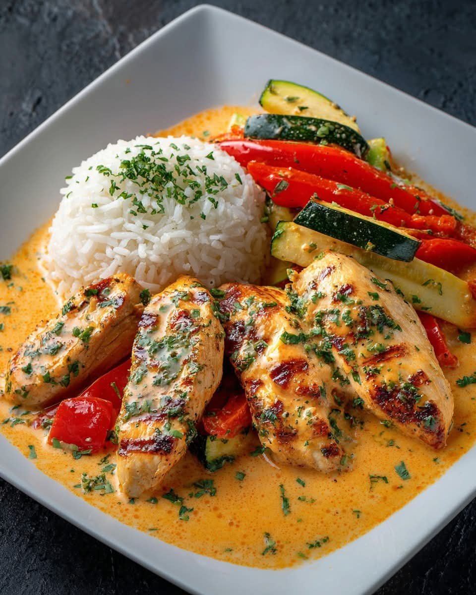 This dish combines juicy, golden-seared chicken with a rich garlic-herb cream sauce, sauteed zucchini and bell peppers, and perfectly cooked rice. It’s creamy yet fresh — the perfect blend of comfort and Mediterranean lightness.