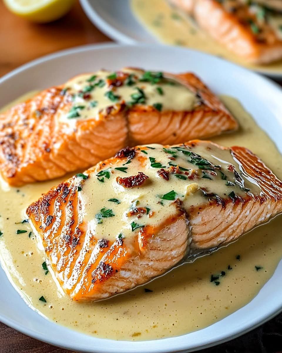 “Marry Me” Salmon is a rich and flavorful dish featuring pan-seared salmon fillets smothered in a creamy garlic-Parmesan sauce with sundried tomatoes and herbs. The name comes from how irresistible it is—legend says it could make someone fall in love with you at first bite!