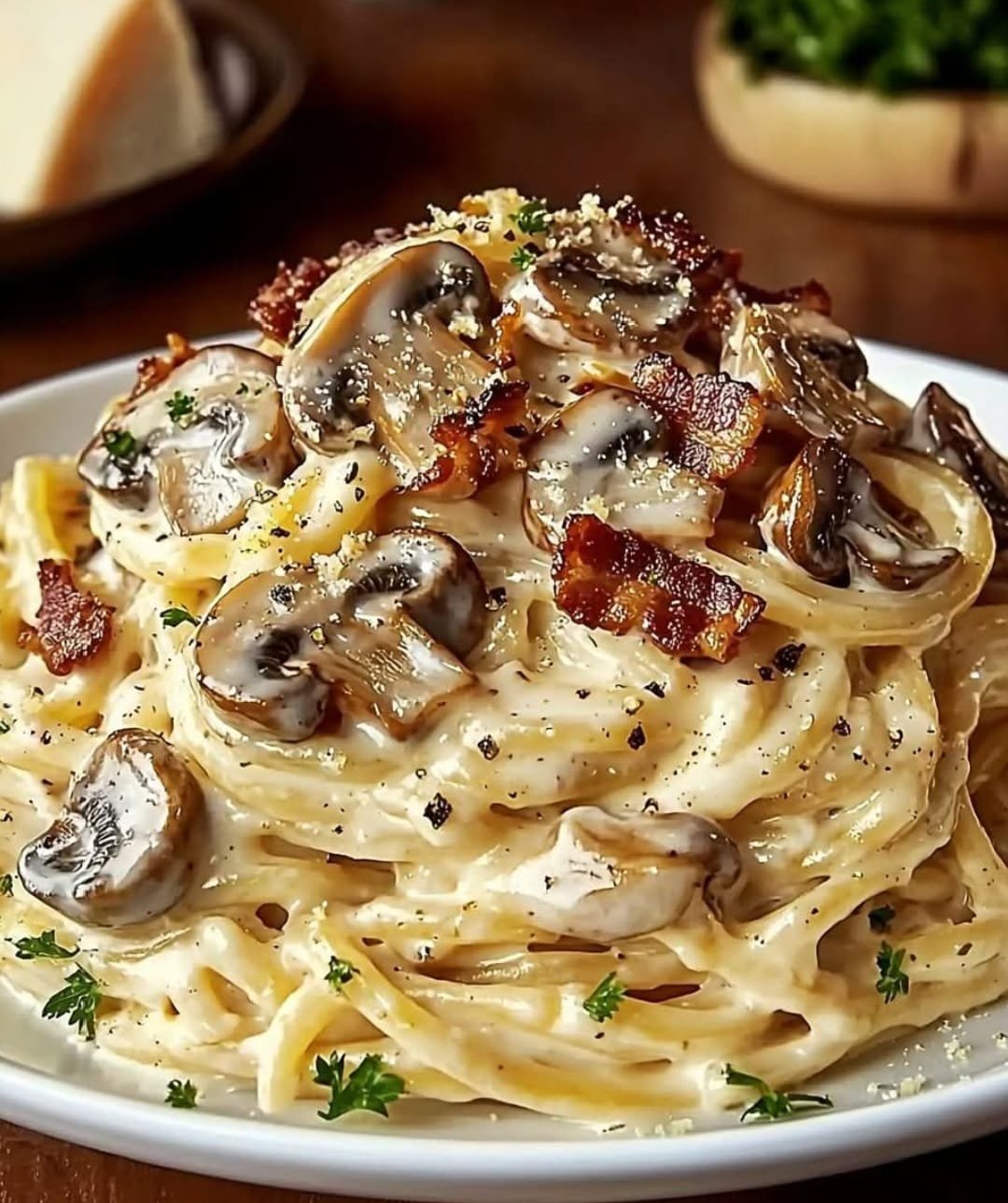 This Creamy Garlic Mushroom and Bacon Pasta is a rich and indulgent dish, combining crispy bacon, sauteed mushrooms, and a velvety garlic parmesan cream sauce. It’s a quick and easy meal that delivers restaurant-quality flavor in under 30 minutes, making it perfect for a comforting weeknight dinner or an elegant meal for guests.