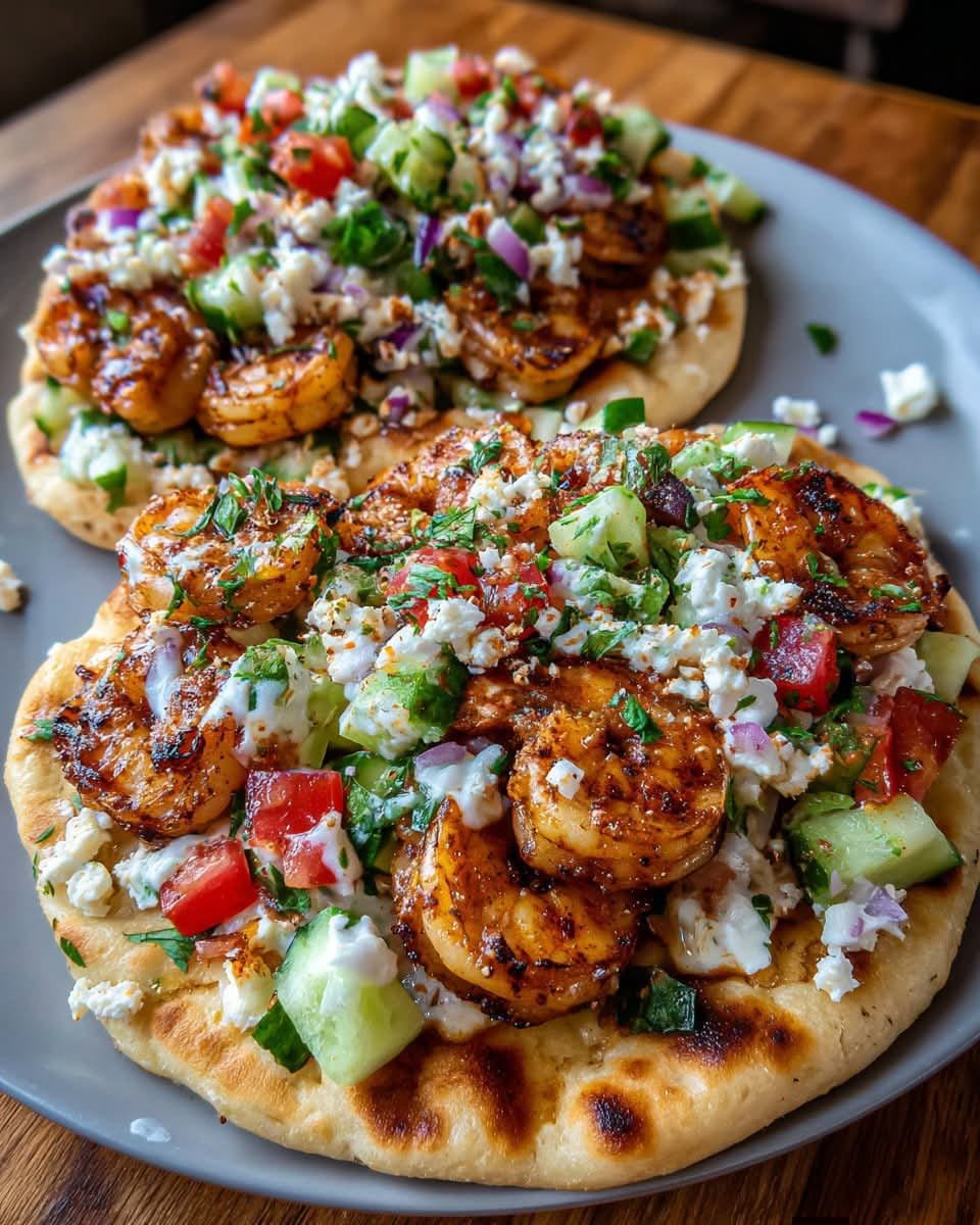 Fresh, vibrant, and bursting with Mediterranean flavor, this Creamy Greek Shrimp Flatbread is the perfect balance of light and satisfying. Juicy, seasoned shrimp sit atop soft flatbread layered with cool, creamy tzatziki, crisp vegetables, and tangy feta cheese.