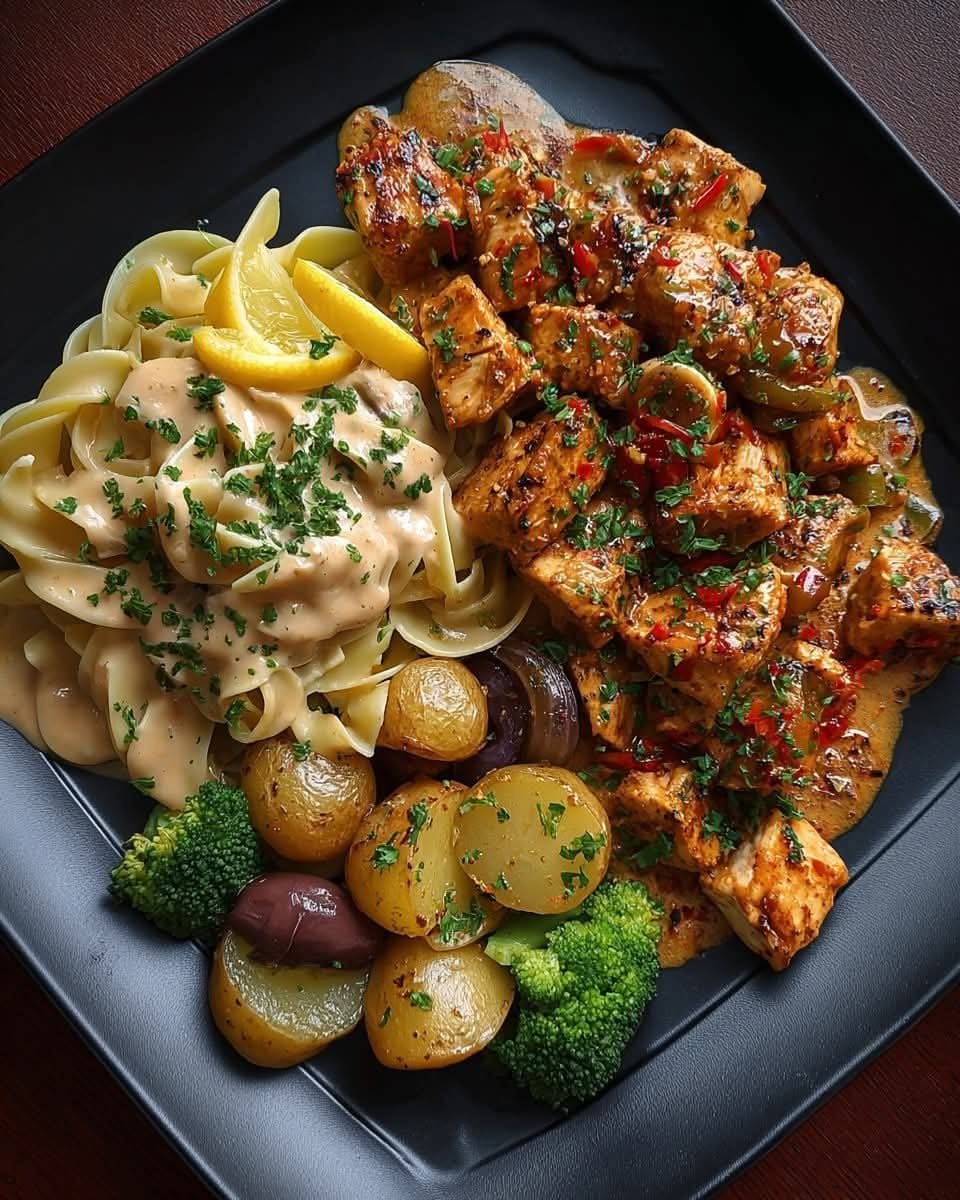 This dish gives you creamy pasta, tender grilled chicken, and a full tray of roasted Mediterranean vegetables in one meal. The lemon and parsley keep the sauce fresh, while the grilled chicken adds a smoky contrast. It’s a good recipe for weeknights but still special enough for guests. You can customize the vegetables, adjust the creaminess, or swap in your favorite protein without changing the spirit of the dish. If you want a one-pan baked version or a lighter sauce with yogurt, I can make that too.