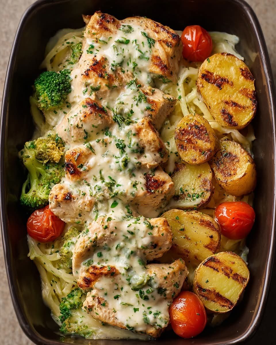 A warm, satisfying meal featuring juicy herb-seasoned chicken, creamy herbed pasta, perfectly grilled/roasted potatoes, and tender garlic broccoli. It’s a restaurant-style comfort dish with balanced flavors and a Mediterranean-friendly twist.