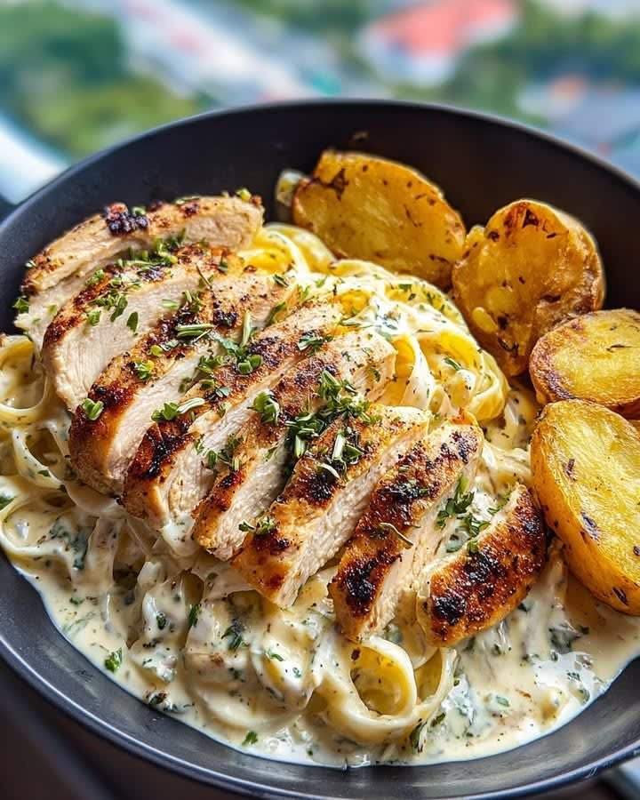 This dish combines tender fettuccine tossed in a light, creamy herb sauce with juicy grilled chicken and crispy roasted potatoes. It’s rich in flavor but made healthier with olive oil, Greek yogurt, and fresh herbs — the perfect balance of indulgence and nourishment.