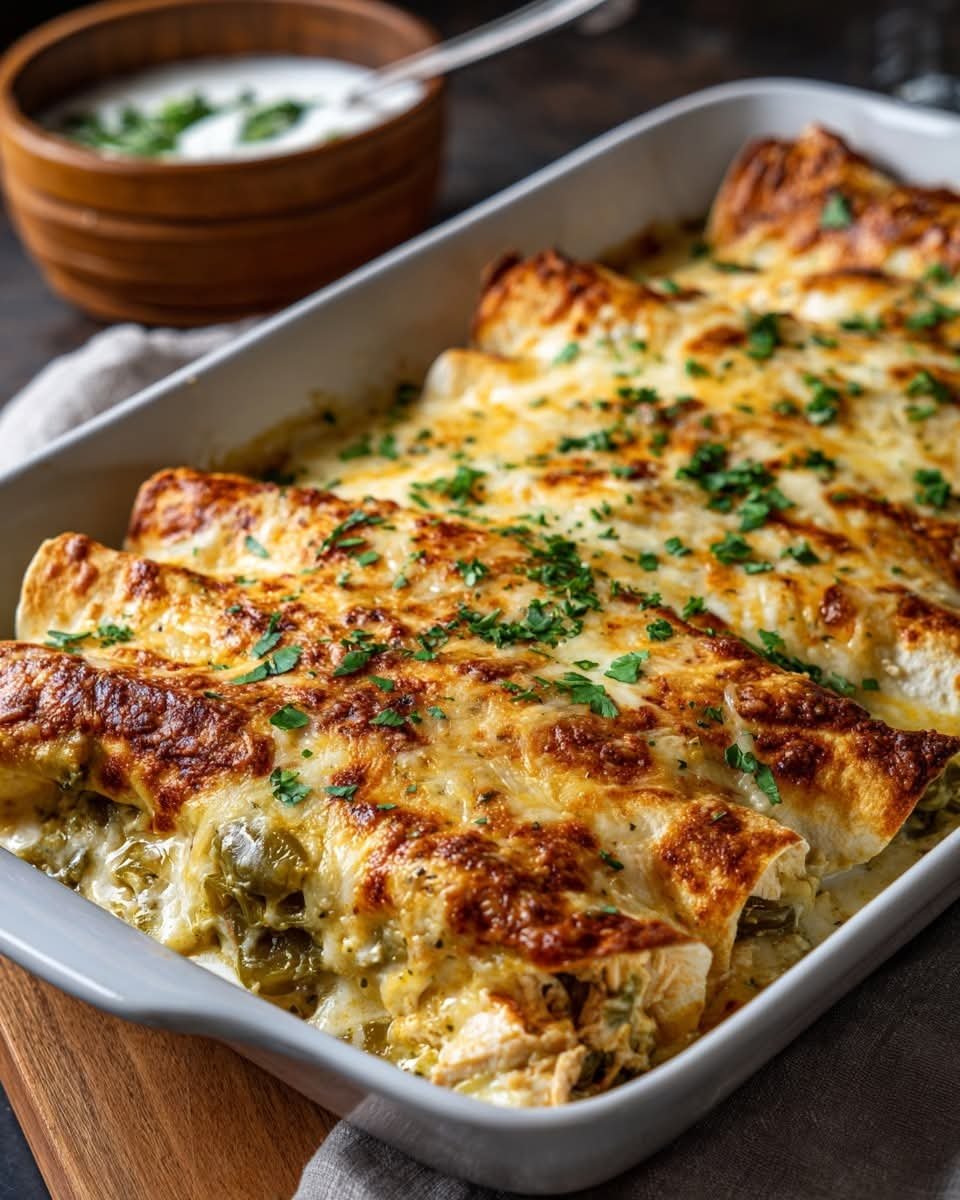 Tender shredded chicken is wrapped in tortillas, smothered with a creamy jalapeno sauce, topped with melted cheese, and baked until golden. A perfect dish for family dinners or entertaining when you want Tex‑Mex comfort food with a spicy kick.