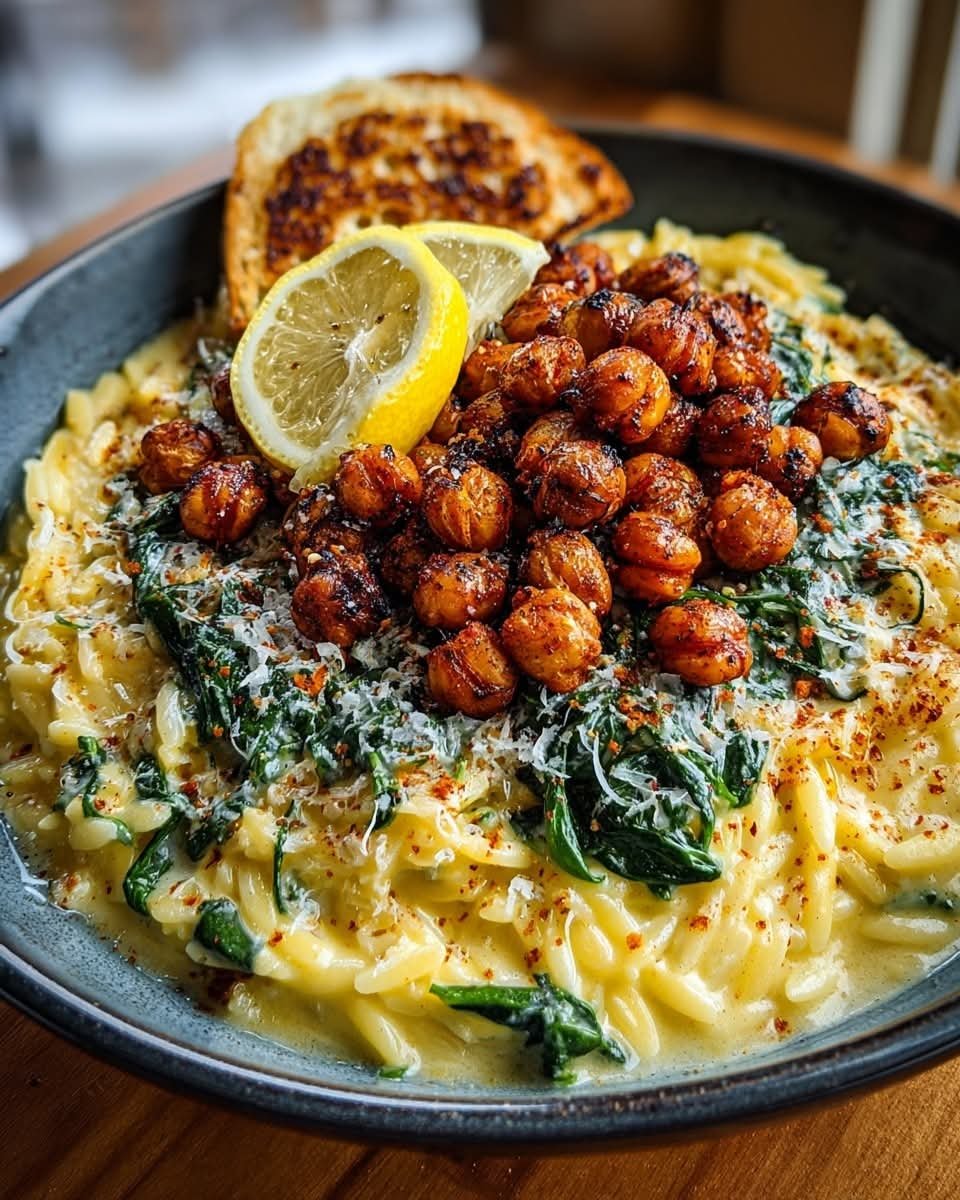 This Creamy Lemon Ricotta Orzo with Garlic-Roasted Chickpeas is the perfect blend of comfort and freshness. Tender orzo pasta is coated in a luxuriously creamy ricotta sauce infused with bright lemon flavor, while crispy, golden garlic-roasted chickpeas add a crunchy, protein-rich topping.