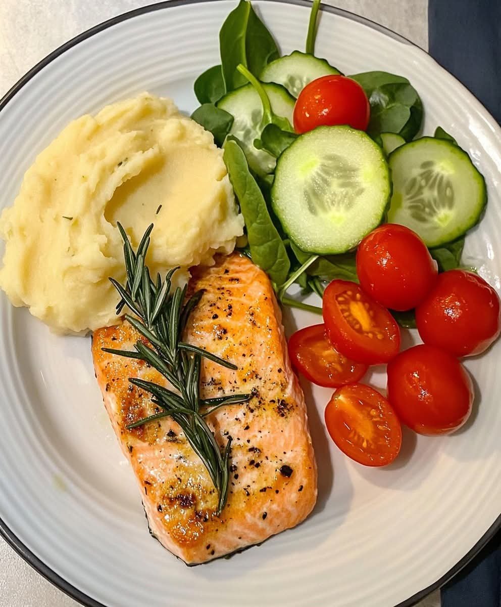This plate is giving elegant, clean, and straight-up delicious. You’ve got a perfectly seared salmon fillet topped with fresh rosemary, silky mashed potatoes, crisp cucumber slices, sweet cherry tomatoes, and leafy spinach—aka a balanced meal that looks fancy but is crazy easy to whip up. Total weeknight win, total glow-up vibes.