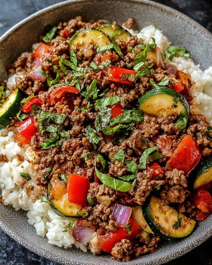 This dish features savory ground beef simmered in a creamy, herb-infused Mediterranean sauce with sautéed vegetables. It’s rich yet light, fragrant with garlic, oregano, parsley, and lemon, and filled with veggies like zucchini, bell pepper, and spinach.It pairs beautifully with rice, couscous, pita, quinoa, or even mashed potatoes. A perfect 30-minute comforting dinner!