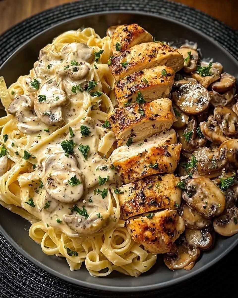 This dish is the ultimate comfort food: tender chicken breast cooked to perfection, sautéed mushrooms, and a velvety garlic cream sauce tossed with fettuccine. Perfect for cozy weeknight dinners or an elegant weekend meal, it’s rich, flavorful, and surprisingly easy to make. The creamy sauce clings to every strand of pasta, while a sprinkle of fresh parsley adds brightness.