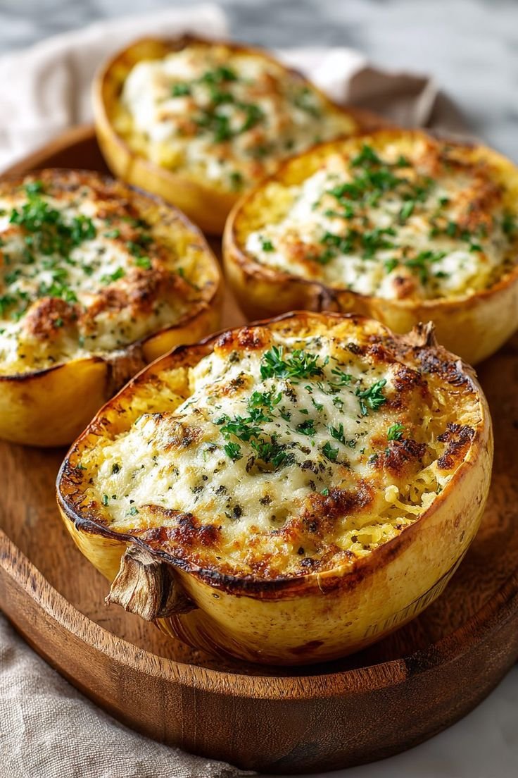 Creamy Pesto Stuffed Spaghetti Squash is a comforting yet healthy dish where roasted Spaghetti Squash strands are mixed with creamy sauce and fragrant Pesto, then baked until warm and flavorful.This dish offers a lighter alternative to pasta while still delivering rich, savory flavor. It can be served as a vegetarian main dish or paired with chicken for extra protein.