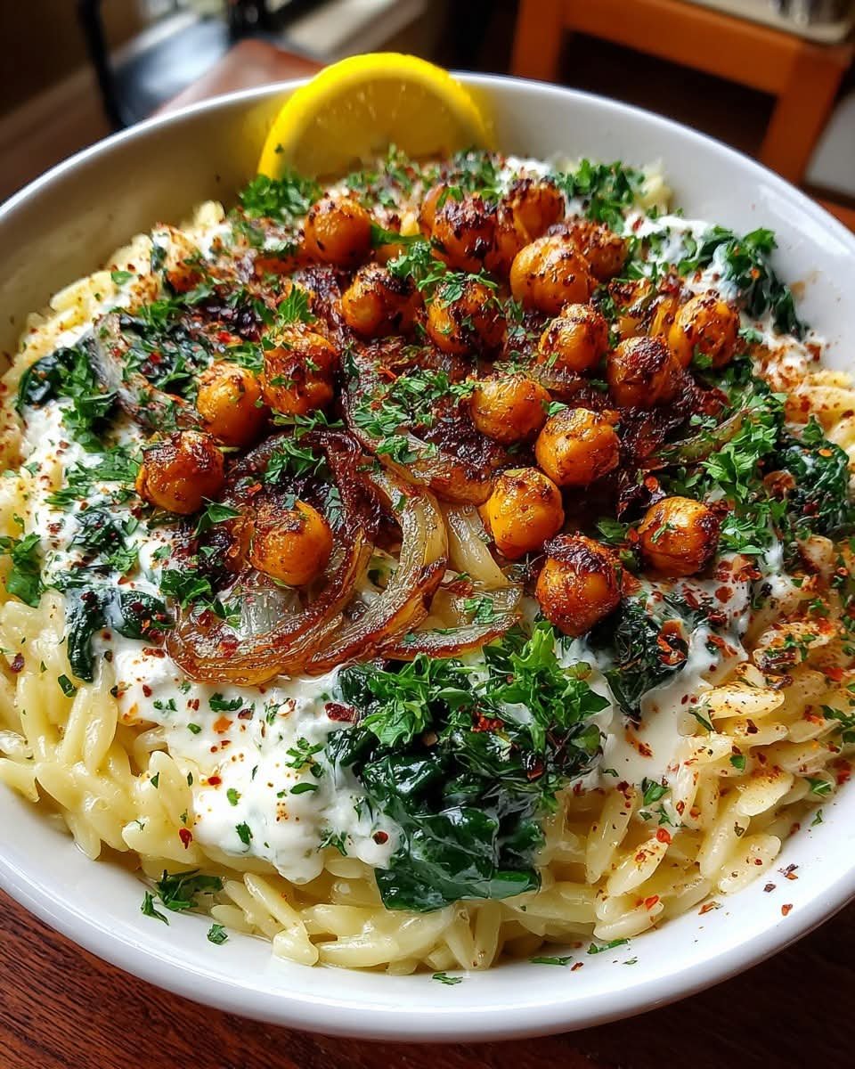 This creamy ricotta and spinach orzo is a comforting, restaurant-style dish made with tender pasta coated in a velvety ricotta sauce, topped with deeply caramelized onions and crunchy roasted chickpeas. It’s vegetarian, nutritious, and perfect for a satisfying weeknight meal or elegant lunch.