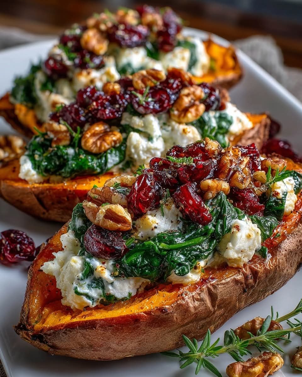 Creamy Ricotta & Spinach Stuffed Sweet Potatoes with Balsamic Cranberry Glaze