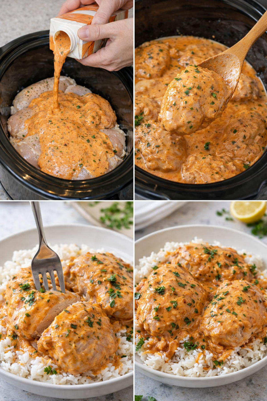 Creamy Slow-Cooked Chicken with Rice is a comforting, one-pot meal featuring tender chicken simmered in a rich, savory cream sauce and served over fluffy rice. The slow cooking process allows the chicken to absorb all the flavors, creating a creamy, hearty dish that’s perfect for busy weeknights or cozy family dinners.