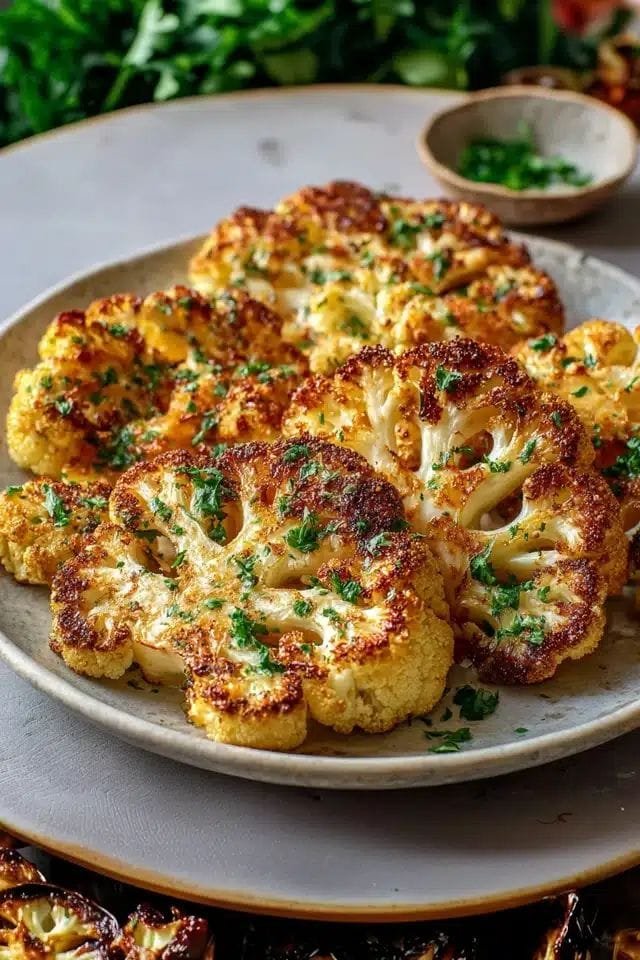 Thick slices of cauliflower, seasoned and coated until crisp, then baked to perfection. These “steaks” make a hearty vegetarian main dish or a fantastic side with Mediterranean or modern healthy meals.