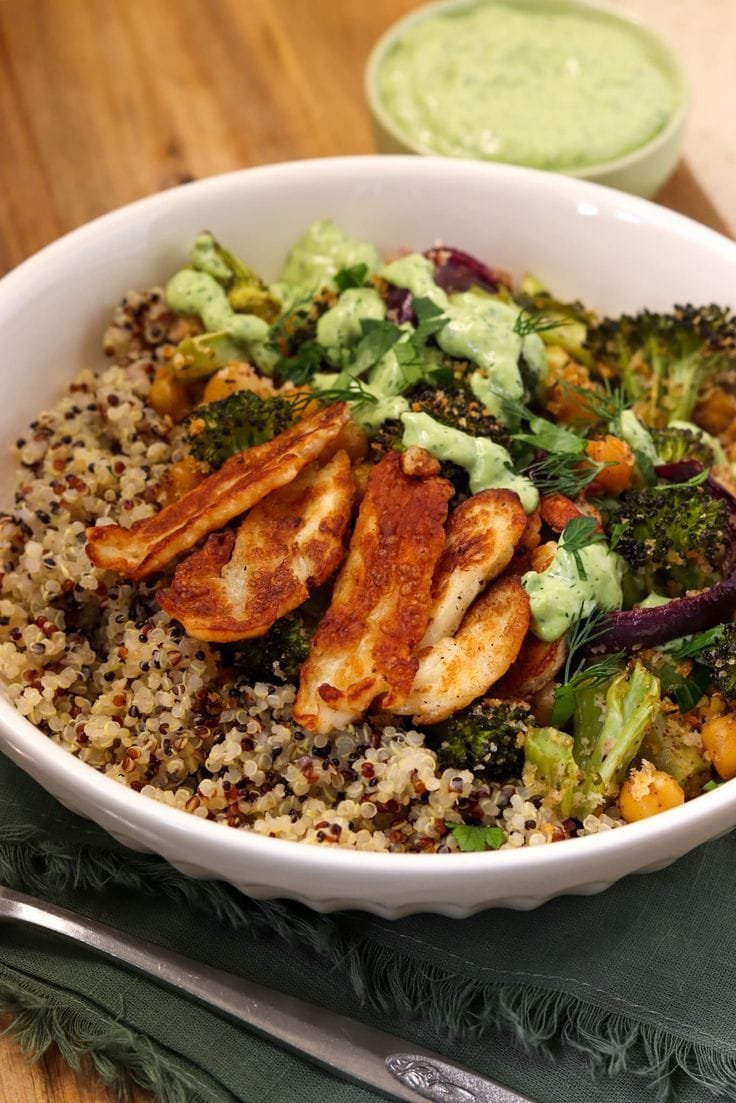 This Mediterranean-inspired bowl features crispy roasted broccoli and golden-seared halloumi cheese, all brought together with a bright, herby garlic tahini dressing. It’s a perfect balance of salty, creamy, fresh, and tangy flavors—with protein, fiber, and healthy fats in every bite.