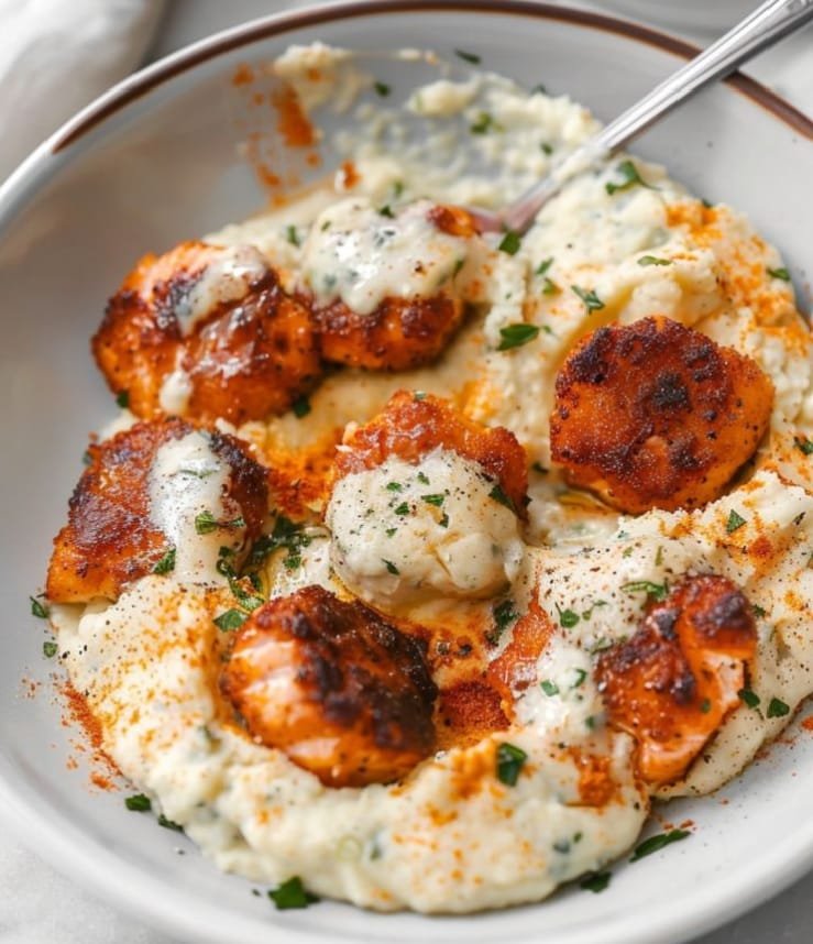 Crispy Cajun Salmon Nuggets over Garlic Cream Mash.This dish brings together zesty spice, crispy texture, and velvety mashed potatoes — perfect for a cozy dinner that still feels fresh and modern.