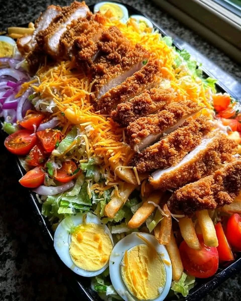 The Crispy Chicken & Loaded Fries Salad Bowl is a hearty comfort-meets-fresh dish that combines crunchy golden chicken, seasoned fries, and vibrant salad ingredients in one satisfying bowl. Crispy chicken pieces sit on a bed of lettuce, topped with loaded fries, fresh vegetables, cheese, and a creamy tangy dressing.