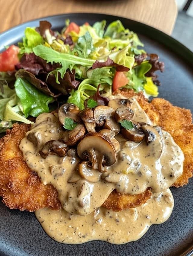 Crispy Chicken Schnitzel with Creamy Mushroom Sauce and Fresh Salad