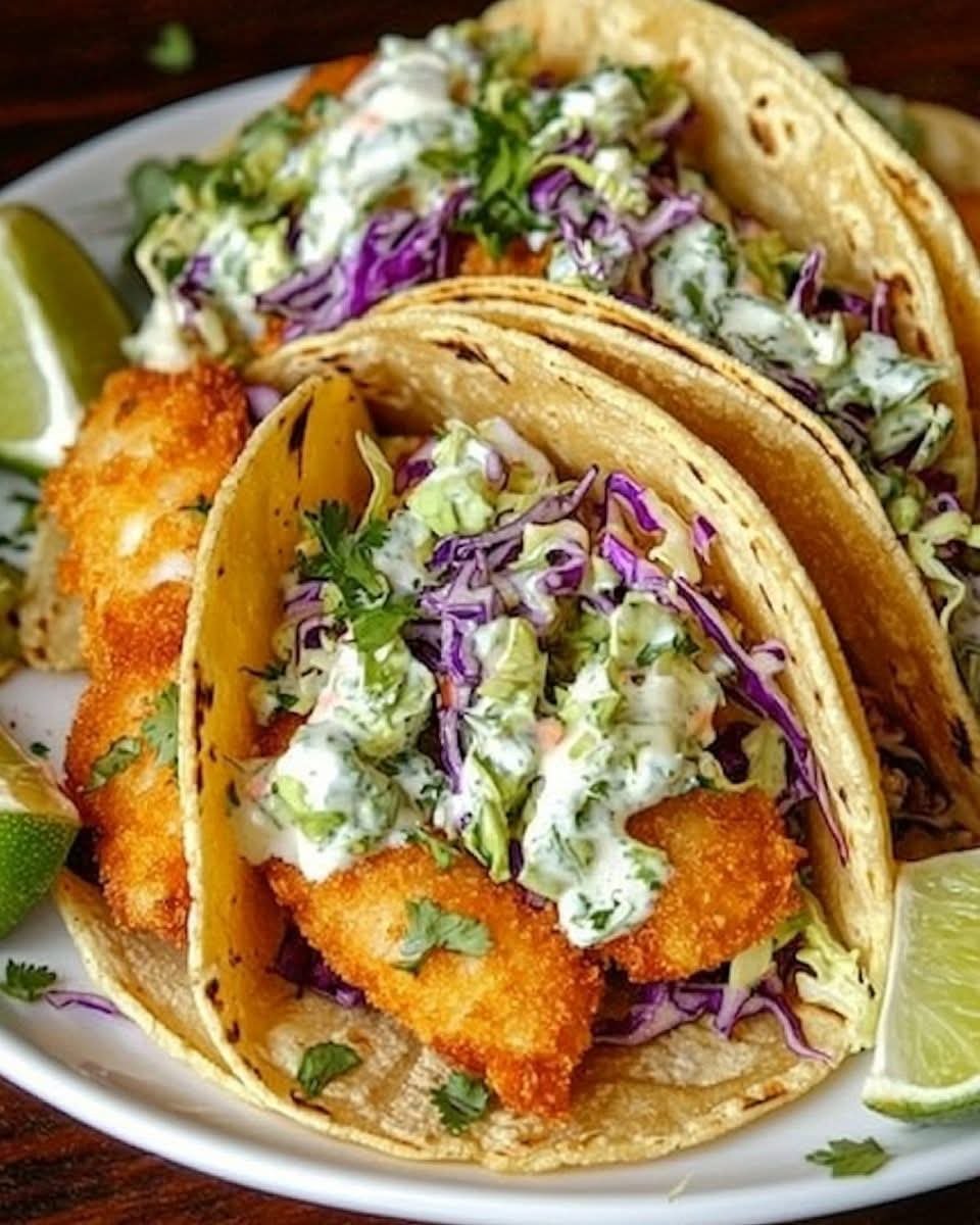These Crispy Fish Tacos with Cilantro Lime Slaw are the ultimate blend of texture and flavor. Crispy, golden fish fillets are nestled into warm tortillas and topped with a zesty, creamy cilantro lime slaw for a refreshing crunch in every bite. Perfect for a weeknight dinner or a taco night party!