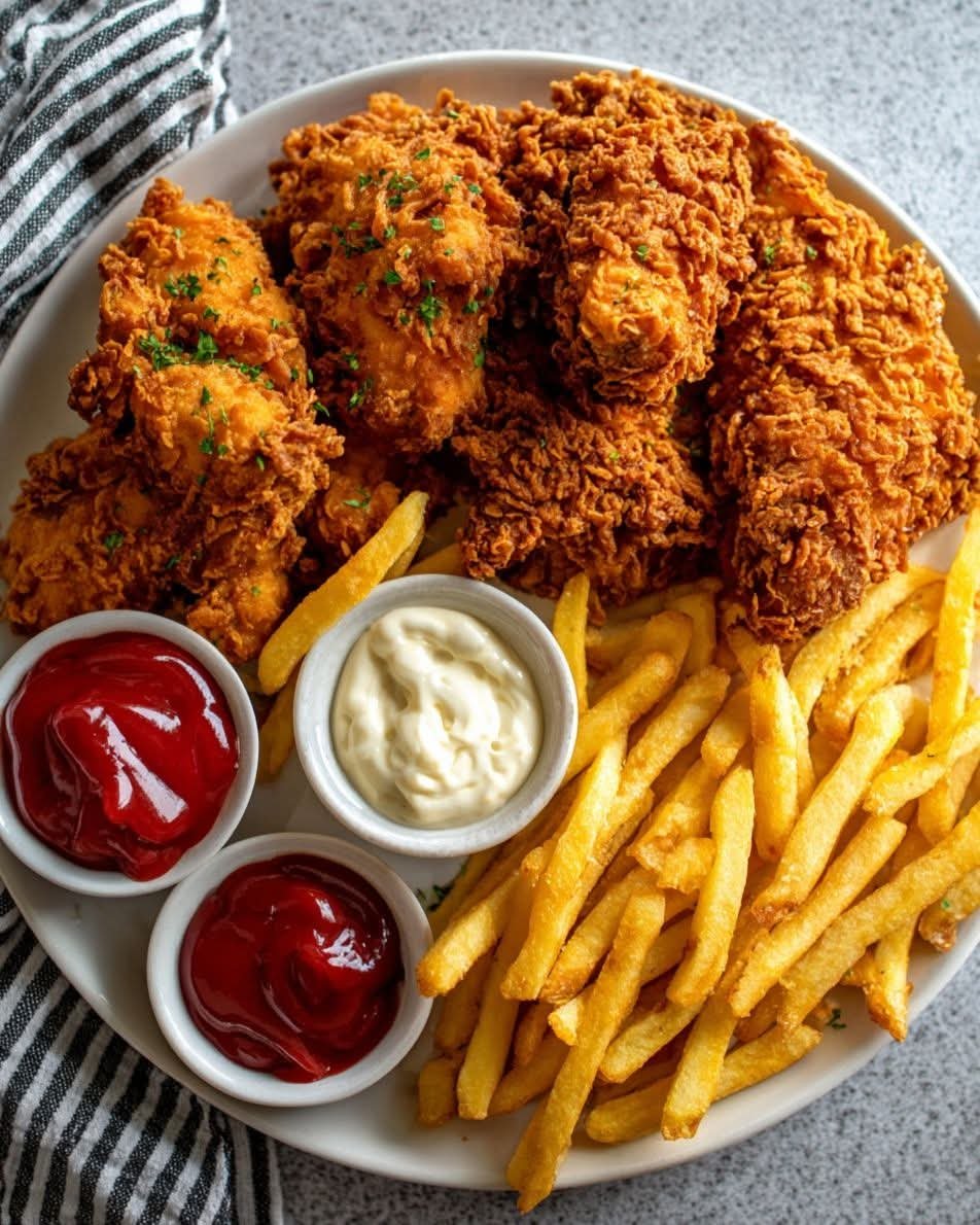 Serve the crispy fried chicken hot with golden fries. Add ketchup, mayonnaise, or a spicy dip for extra flavor.