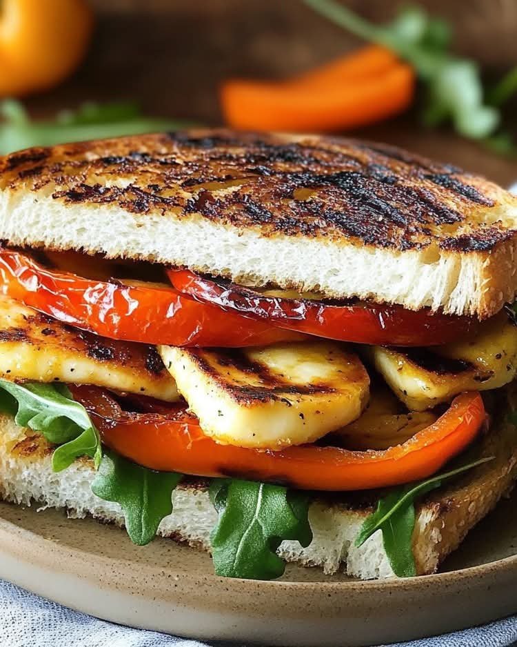 A delicious Mediterranean-inspired sandwich that features golden, crispy grilled halloumi cheese, roasted sweet bell peppers, fresh greens, and a tangy yogurt-garlic spread, all layered between toasted bread. This vegetarian sandwich is hearty, savory, and perfect for lunch or a light dinner.