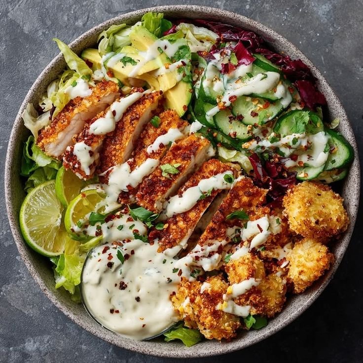 The Crispy Salmon Salad Bowl features golden, pan-seared Salmon on a bed of fresh greens and colorful vegetables. Topped with creamy avocado, crunchy toppings, and a tangy dressing, this salad is high in protein, omega-3 fatty acids, and packed with flavor. Perfect for a nutritious lunch or dinner.