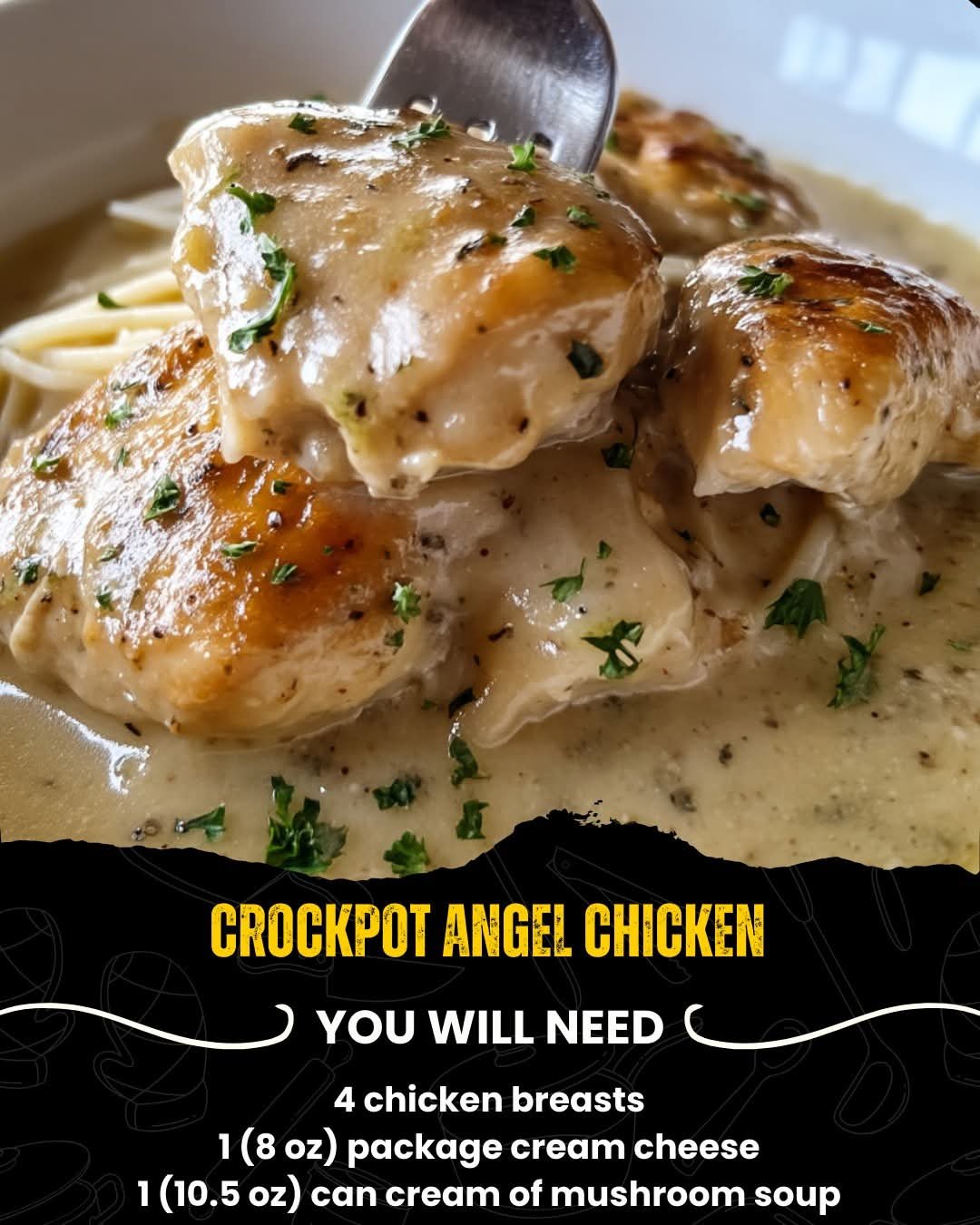 This dish features tender chicken slow-cooked in a rich, creamy mushroom and herb sauce. Originally served over angel hair pasta (hence the name), it’s cozy, satisfying, and effortless.