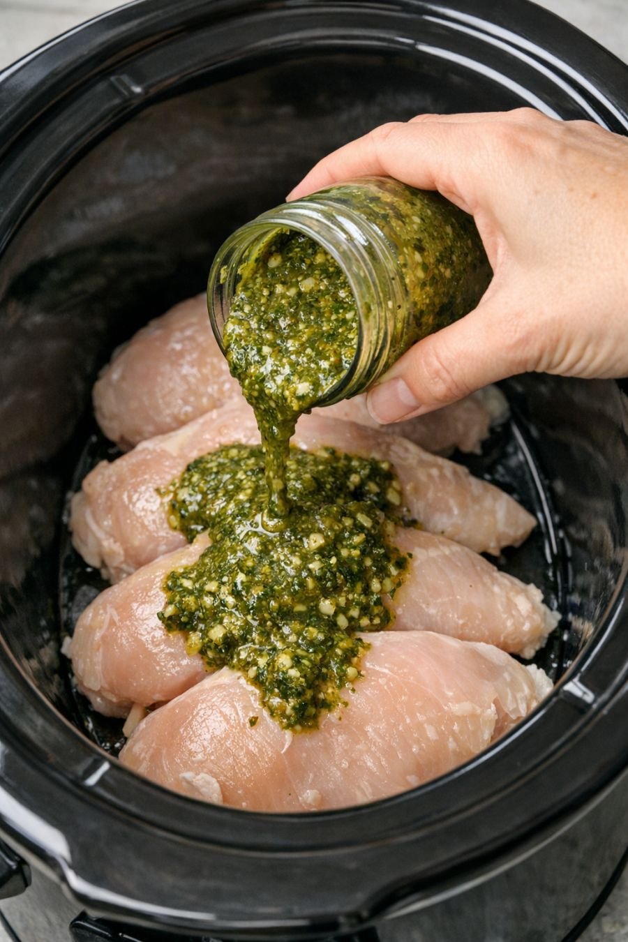 An easy, flavorful slow cooker meal made with juicy chicken breasts and rich basil pesto. Simple ingredients, bold taste!