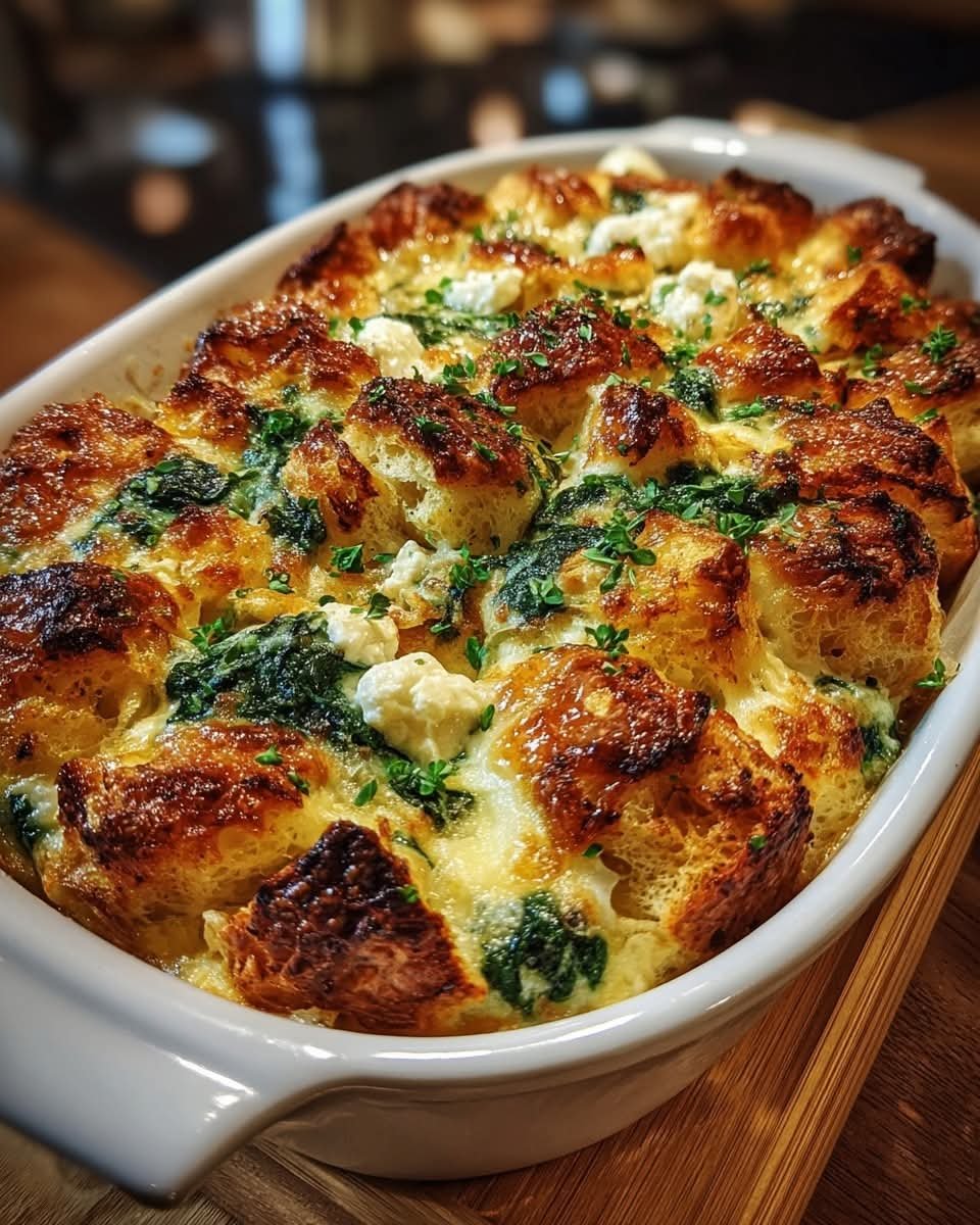 This Croissant Strata with Spinach, Feta & Gruyère is a rich, savory baked dish perfect for breakfast, brunch, or a light dinner. Buttery croissants soak up a creamy egg custard, while tender spinach, salty feta, and nutty Gruyère create a beautifully balanced flavor. It’s elegant enough for guests yet easy enough to prepare ahead—ideal for stress-free mornings.