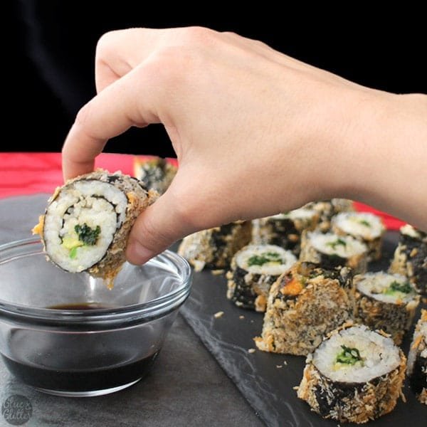 - Cook and Cut: Transfer the panko breadcrumbs to a small bowl. Take your first sushi roll and equally dip it in the panko and then the Sriracha Mayo. Put the roll in the basket of your air fryer. Continue with the remaining sushi rolls.