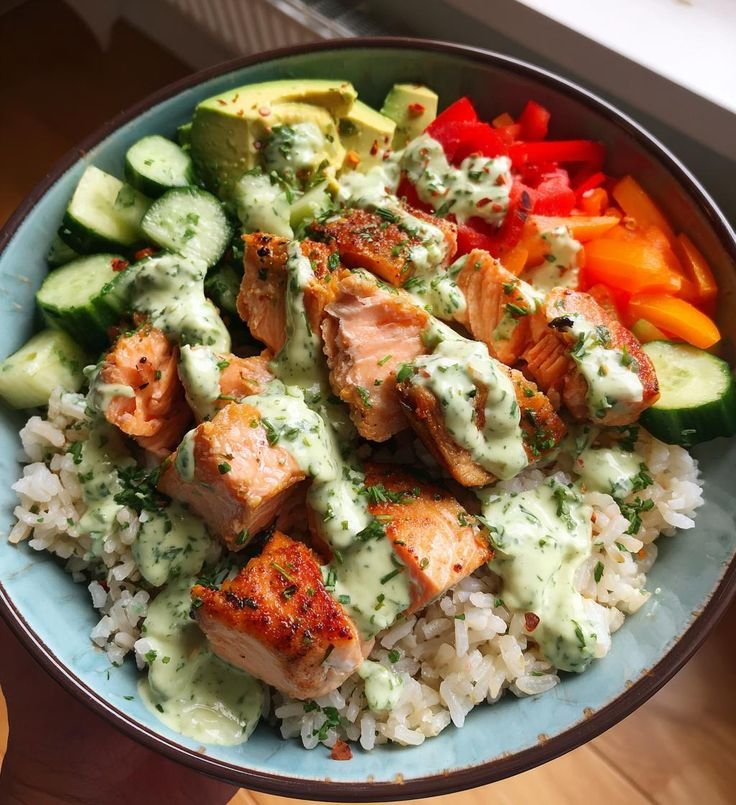 This wholesome bowl layers crispy-seared salmon over a nutty bed of brown rice, topped with crunchy vegetables, toasted nuts, and a creamy herbed tahini sauce that ties everything together. It’s packed with omega-3s, fiber, and bright Mediterranean flavor — perfect for a quick dinner or meal prep lunch.