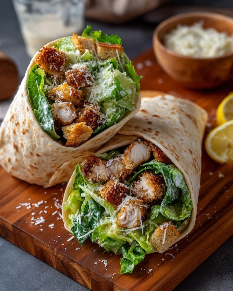 These wraps feature crispy chicken, crunchy romaine lettuce, creamy Caesar dressing, and Parmesan cheese, all rolled up in a soft tortilla for a perfect handheld lunch or light dinner.