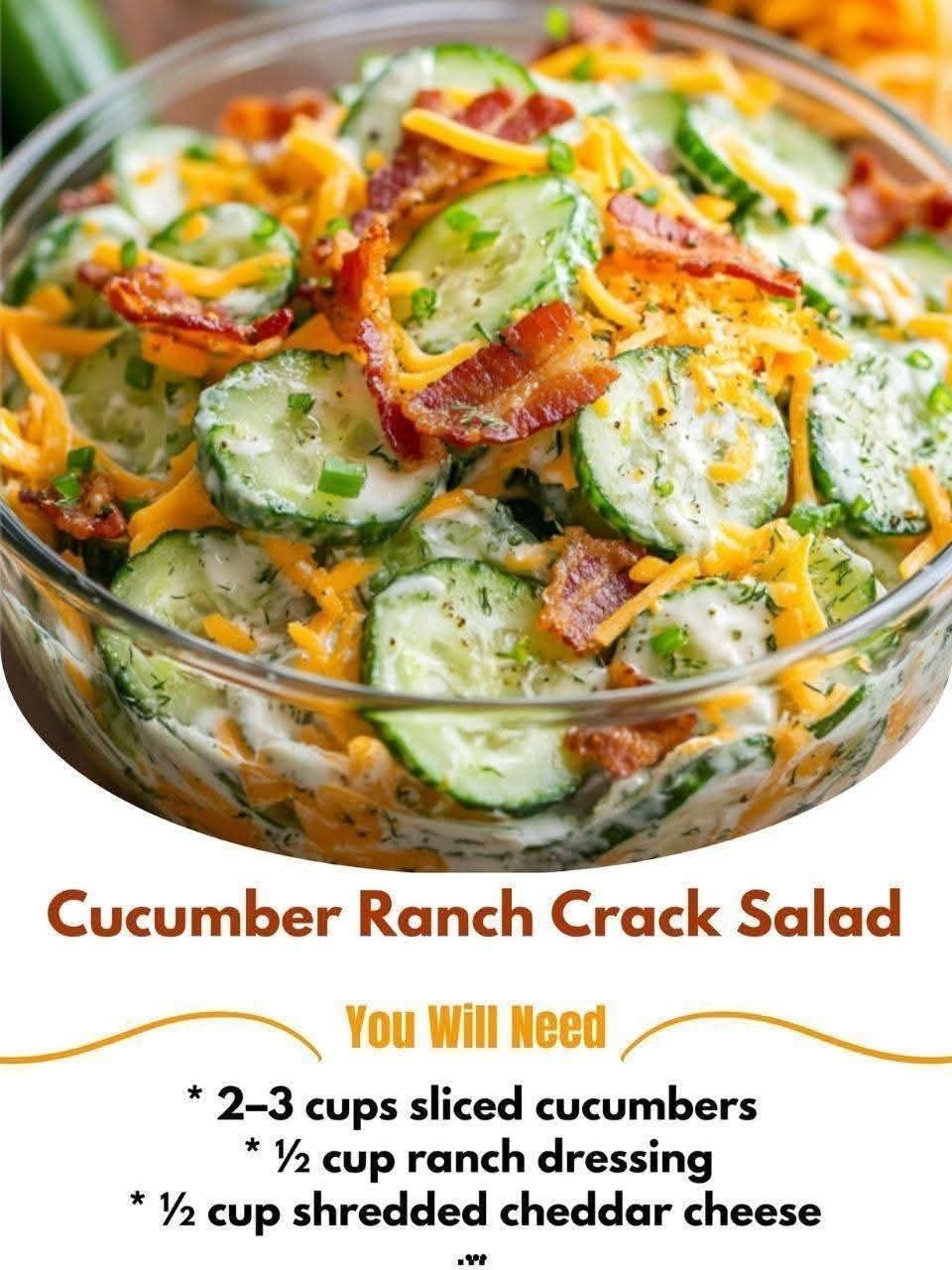 This refreshing salad combines crisp cucumbers with creamy ranch dressing, smoky bacon, sharp cheddar cheese, and fresh herbs. The texture is crunchy and creamy at the same time, while the flavors balance freshness with savory richness.