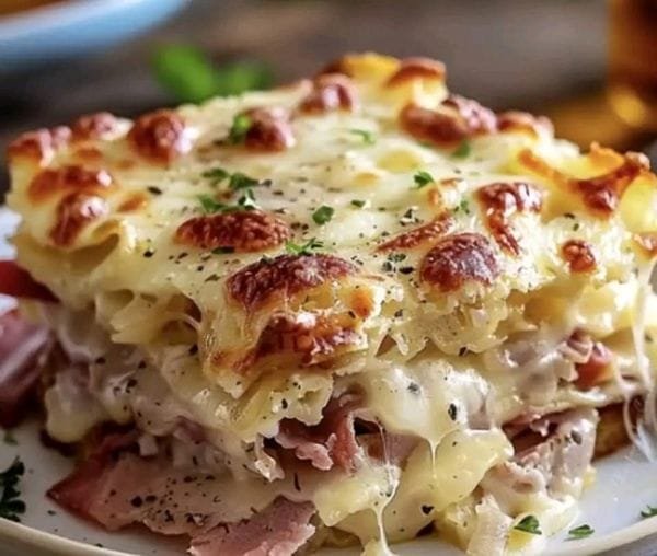 Layer the corned beef, sauerkraut, Swiss cheese, sliced dill pickles, and onion on top. Layer the remaining bread, corned meat, sauerkraut, and cheese again. - Combine the wet ingredients: In a spacious basin, vigorously blend the Thousand Island dressing, eggs, milk, and melted butter until well mixed. Distribute the mixture evenly over the tiered ingredients in the baking dish.