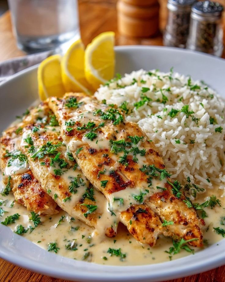Tender, golden-pan-seared chicken breasts served in a silky, bright, creamy lemon sauce, paired with aromatic garlic herb rice. This dish is comforting yet fresh, elegant enough for guests and easy enough for weeknights.
